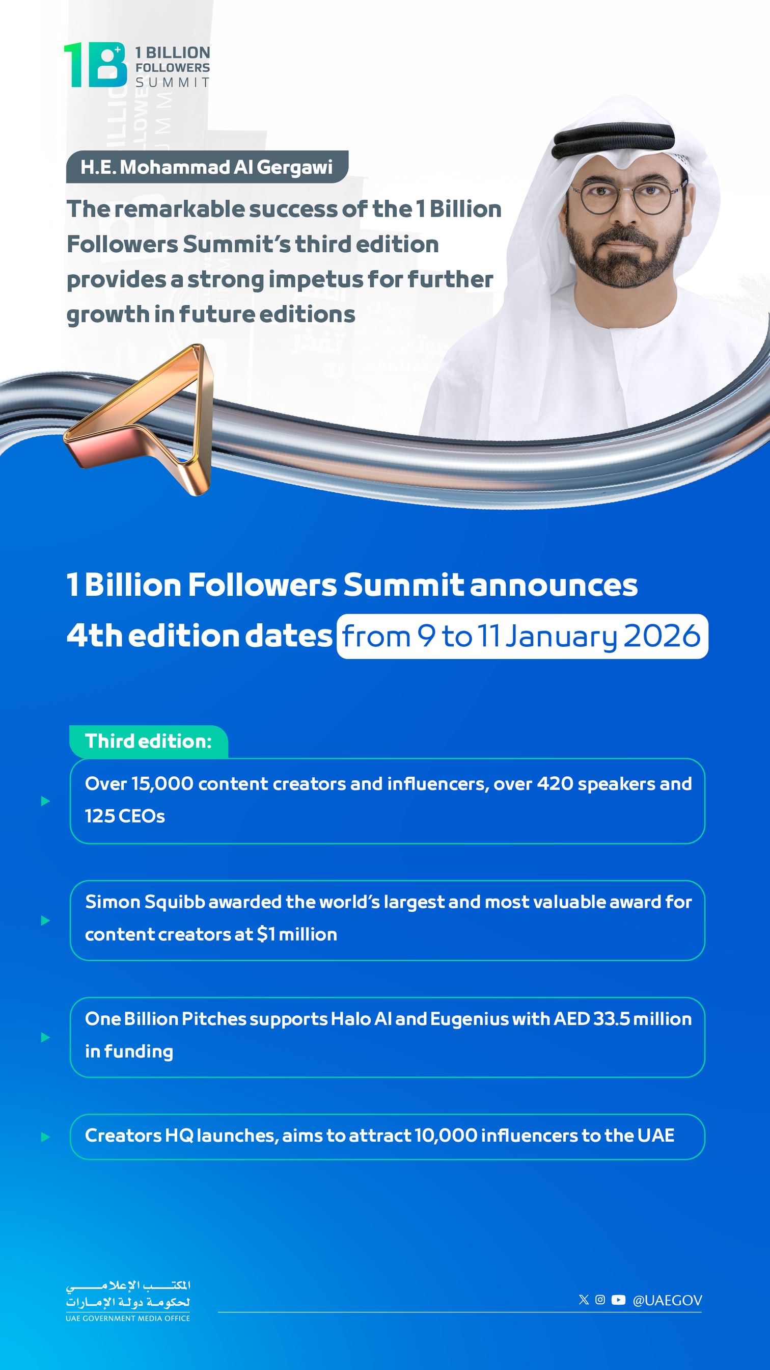 Mohammad Al Gergawi, Minister of Cabinet Affairs, said, “The remarkable success of the 1 Billion Followers Summit, reflected in the growth of engagement among content creators and key players in this vital sector shaping the future, provides a strong impetus for further growth in future editions. As the largest global event dedicated to the content economy, the Summit underscores the UAE's strategic vision of fostering a sustainable economic sector rich with opportunities in this field.”
