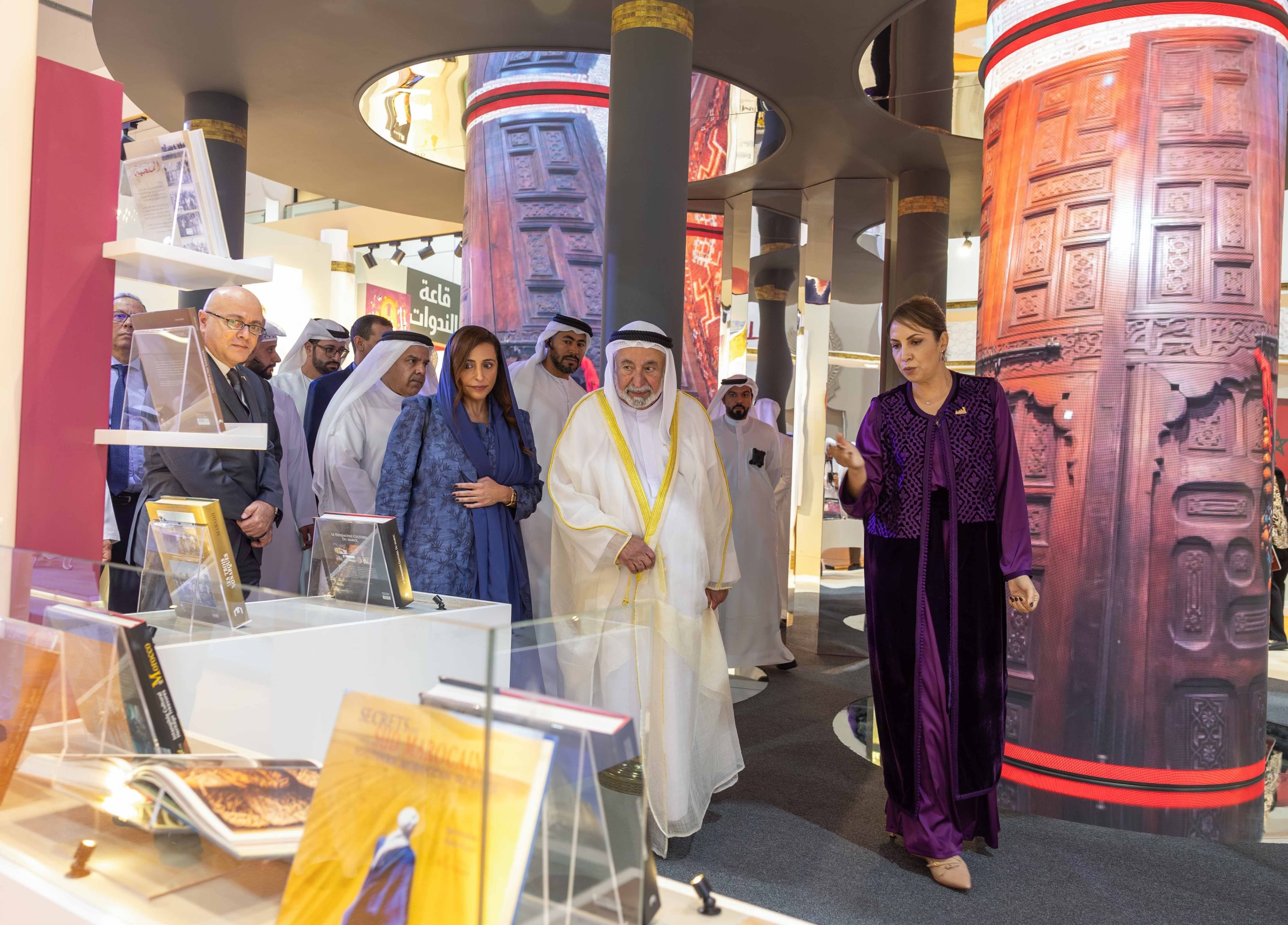 The Ruler of Sharjah was received by H.H. Sheikh Sultan Bin Ahmed bin Sultan Al Qasimi, Deputy Ruler; Sheikha Bodour bint Sultan Al Qasimi, Chairperson of SBA; Sheikh Salem bin Abdulrahman Al Qasimi, Chairman of the Sharjah Ruler's Office; Sheikh Khalid bin Isam Bin Saqer Al Qassimi, Chairman of the Civil Aviation Department; Sheikh Majid bin Sultan bin Saqer Al Qasimi, Chairman of Districts Affairs Department; Sheikh Salem bin Khalid Al Qassimi, Minister of Culture and Youth; Sheikha Nawar Al Qasimi, Director of the Sharjah Art Foundation; Sheikh Abdullah bin Mohammed bin Butti Al Hamed, Chairman of the National Media Office; top officials, intellectuals and authors.