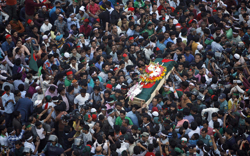 (FILE) Bangladeshi mourners carry the coffin containing the body of blogger Rajib Haider for funeral in Dhaka, Bangladesh. Haider had been critical of the Islamic group Jamaat-e-Islami, whose leader Abdul Quader Mollah was recently given a life sentence for his role in the killing of 381 civilians during the nation’s 1971 war for independence from Pakistan. On Sunday, Feb. 17, 2013, Bangladesh parliament has amended the country’s war crimes law that will allow the prosecution to appeal the life imprisonment of an opposition leader which it says has been lenient. (AP)