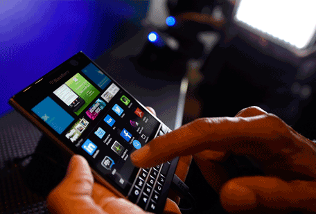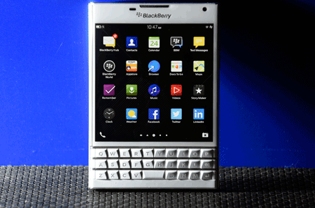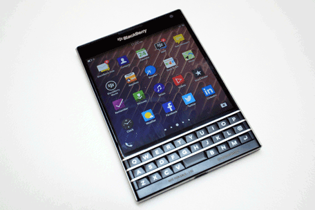 A BlackBerry Passport smartphone is shown at its official launching event in Toronto, September 24, 2014. BlackBerry launched an unconventional new smartphone dubbed the Passport on Wednesday, as it embarked on potentially the most critical phase of its long turnaround push. REUTERS
