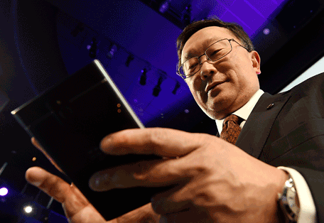 BlackBerry Chief Executive John Chen uses a Passport smartphone following the official launch event in Toronto, September 24, 2014. BlackBerry launched an unconventional new smartphone dubbed the Passport on Wednesday, as it embarked on potentially the most critical phase of its long turnaround push. REUTERS