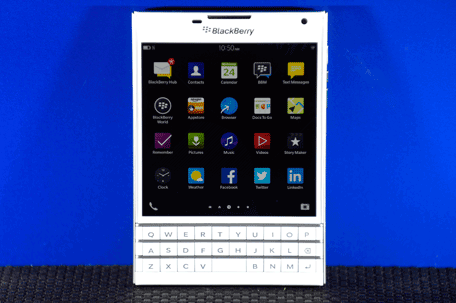 A picture shows a close-up view of the new Blackberry Passport smartphone during at a simultaneous launch event in London on September 24, 2014. BlackBerry on Wednesday unveiled its newest smartphone with a full physical keyboard and a large screen, aiming to return to its roots targeting business users. The BlackBerry Passport, named for its approximate size to the travel document, is designed to win back key corporate users after the struggling Canadian company was effectively knocked out of the highly competitive consumer smartphone market dominated by Apple and Samsung. AFP