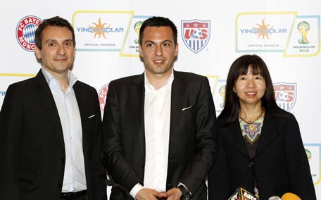 Evangelos Lianos, Executive Director, Dimitrios Bachadakis, Managing Director, and Yan Wen, Managing Director of Yingli Solar at the press conference in Dubai (SUPPLIE)