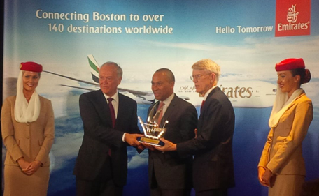 Travelling aboard the Boeing 777-200LR aircraft was Emirates President Tim Clark, who later addressed awaiting dignitaries, which included the Governor of Massachusetts Deval Patrick, saying that an A380 could very well take off for the Boston skies within a year.