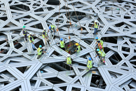 The roof’s complex pattern is the result of a geometric design, repeated at various sizes and angles in eight layers, giving the dome a delicate form that leads to a 'rain of light' effect. These star-shaped elements make up eight layers of cladding weighing a total of 2,000 tonnes. Major work is expected to start in the next few months, including laying the stone flooring of the museum, installation of the display cases for the galleries, and the completion of the museum’s administration building.