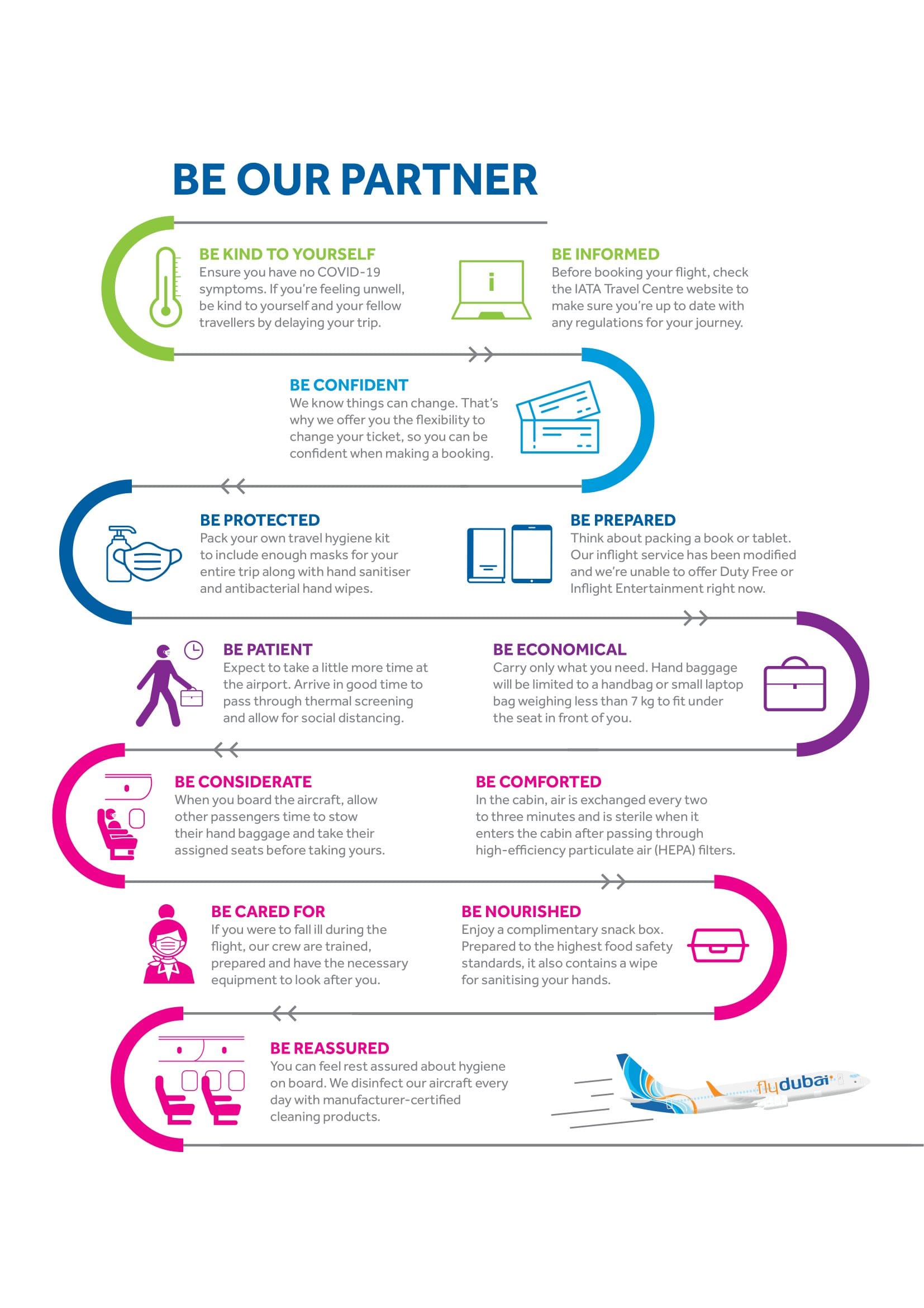 The airline has redesigned its entire passenger journey and built upon the existing high standards of its operations to minimise the risk of transmission of COVID-19. For everyone to realise the benefit of travel, passengers need to have confidence that the airline is taking the correct measures and they also need to understand the role they must play to protect themselves and other passengers. This relationship between the airline and the passenger defines the flydubai partnership. It is recognition that the way in which passengers travel has changed and that these protocols set out the new way of travelling.