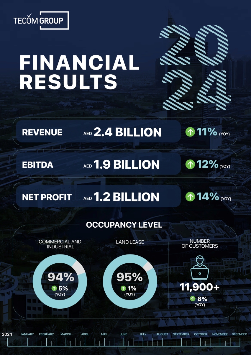 Dubai, UAE, 6 February 2025: TECOM Group PJSC (DFM: TECOM), a leading creator of specialised business districts and vibrant communities, today announced its financial results for the year ended 31 December 2024 (FY 2024). The Group reported a record revenue of AED 2.4 billion, marking an 11% year-on-year (YoY) increase, and a 14% YoY rise in net profit to AED 1.2 billion. These results underscore the success of TECOM Group’s strategy to strengthen its core business proposition in Dubai through targeted portfolio expansion, operational efficiencies, and robust occupancy and retention rates.