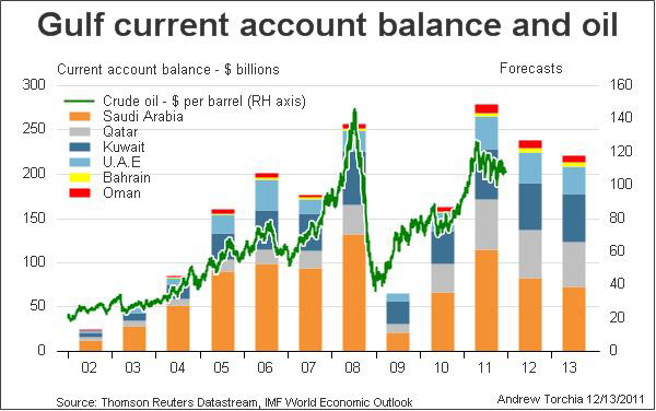 The GCC’s current account surplus – the amount of money it has left to invest abroad after imports of goods and services – is expected to climb from $163 billion in 2010 to $279 billion this year and $238 billion in 2012, according to the International Monetary Fund. Such numbers put the GCC in the same league as China, which the IMF estimates will have a current account surplus of $361 billion this year.