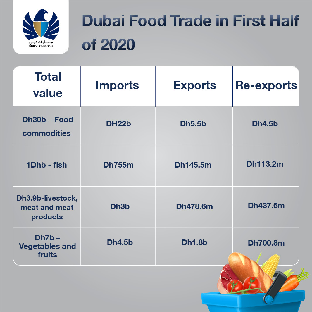 According to the latest trade statistics, Dubai’s food imports touched AED22 billion (6.23 million tonnes), while exports reached AED5.5 billion (2.1 million tonnes) and re-exports amounted to AED4.5 billion (733,000 tonnes) in H1, 2020.