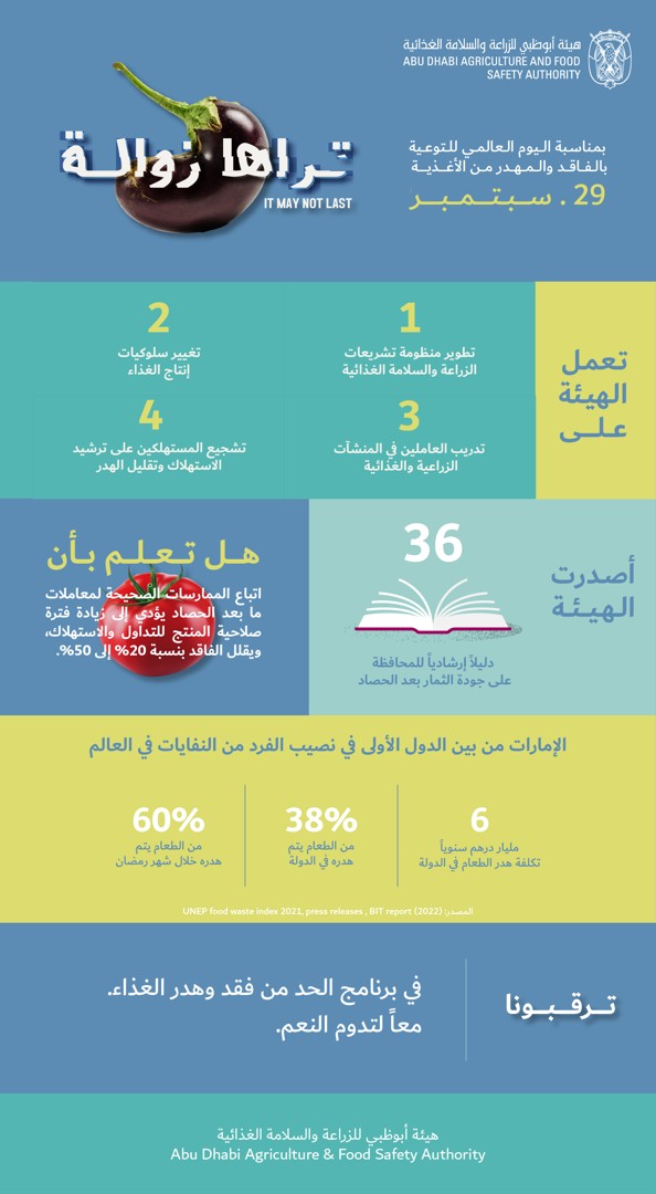 The Abu Dhabi Agriculture and Food Safety Authority (ADAFSA) is intensifying its efforts to develop an integrated strategy to reduce food loss and waste (FLW), and improve the efficiency of the production chain, as part of its commitment to its central role in agricultural and food sustainability in the Emirate of Abu Dhabi.