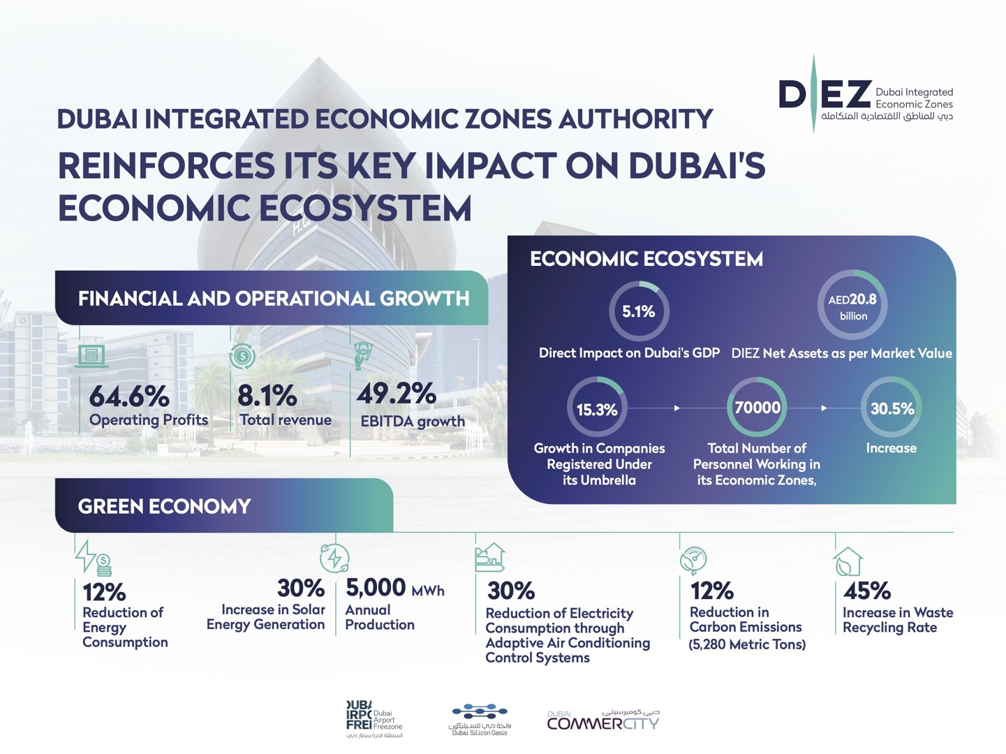 With the market value of its net assets exceeding AED20.8 billion, DIEZ succeeded in reinforcing growth in earnings before interest, taxes, depreciation, and amortisation by 49.2%, alongside an 8.1% increase in total revenues. These figures underscore the role of DIEZ as a key contributor to Dubai's economy. Economic zones overseen by DIEZ including the Dubai Airport Free Zone, Dubai Silicon Oasis, and Dubai CommerCity have seen an increase of 15.3% in companies registered under their umbrella. The total number of personnel working in DIEZ economic zones saw a marked rise of 30.5% to reach 70,000.