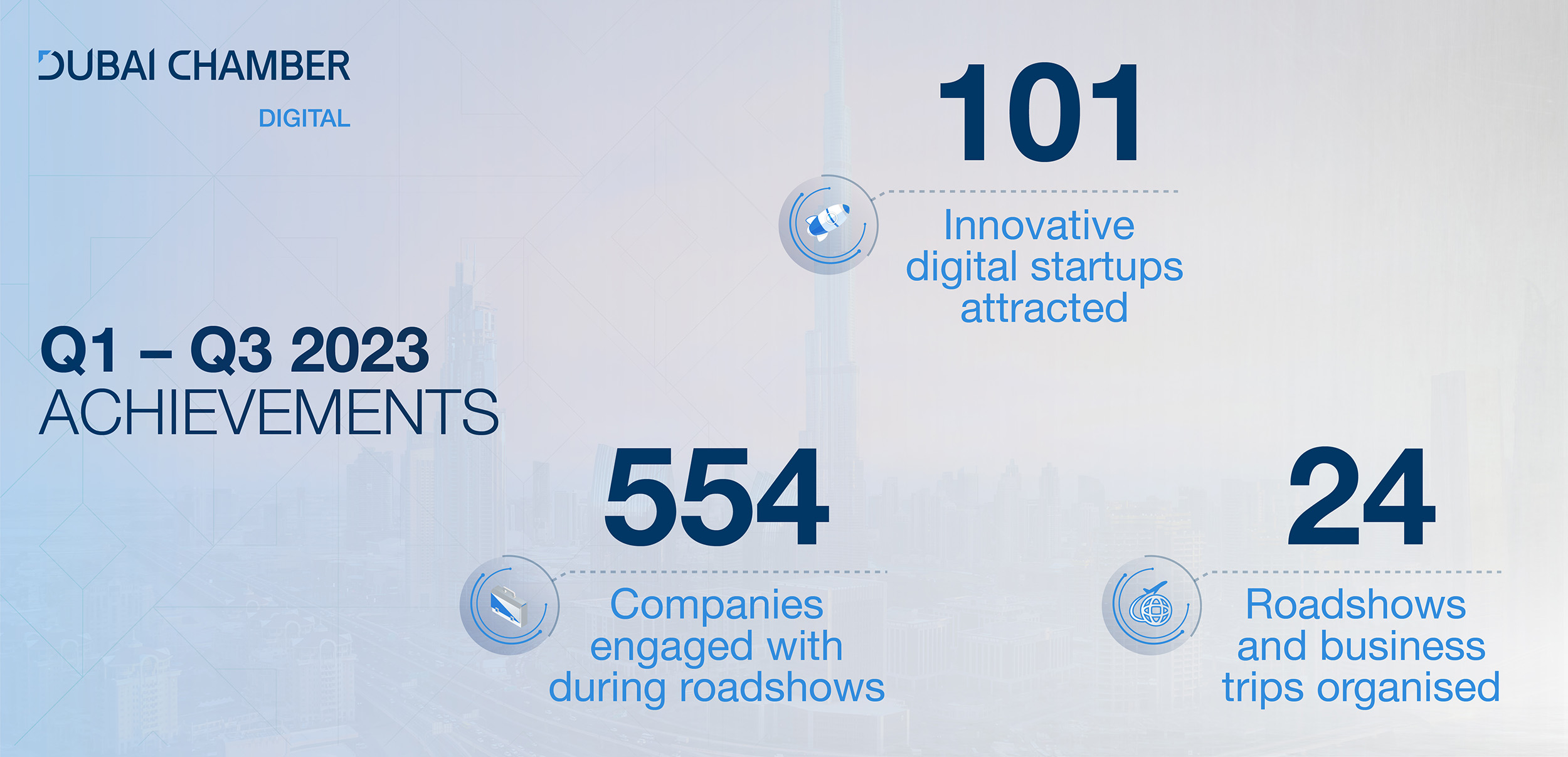 During the nine-month period between January and September, Dubai Chamber of Digital Economy conducted a total of 24 roadshows and business trips across the Middle East, Africa, Asia, and Europe. As part of these missions, business meetings were coordinated with 554 companies including multinationals, SMEs, startups, and scaleups. The meetings created a valuable platform to showcase the huge growth potential in Dubai and highlight the benefits of doing business in the emirate.