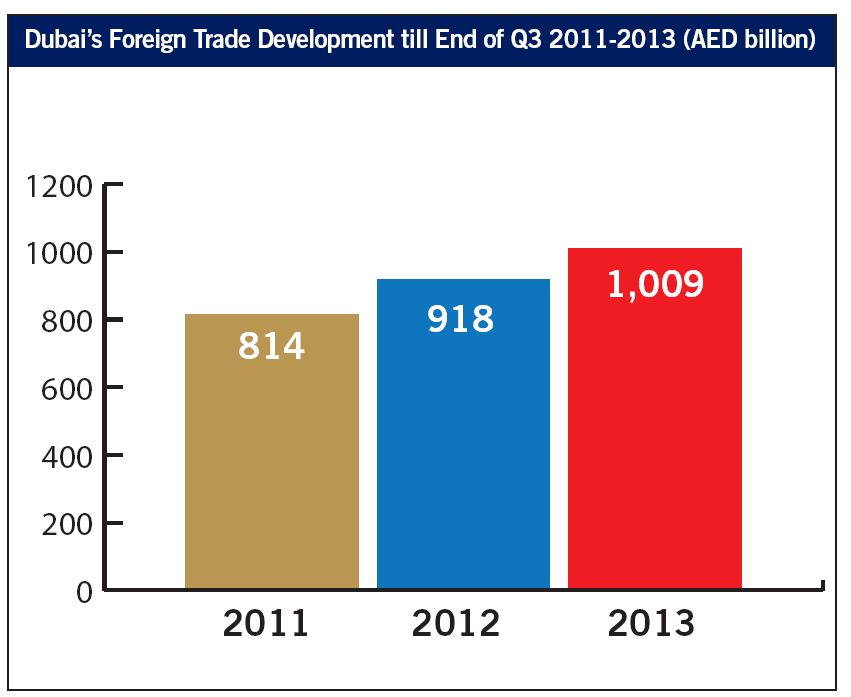 Dubai’s non-oil foreign trade crossed Dh1 trillion mark by the end of Q3 2013 compared to Dh918 billion for the same period in 2012.