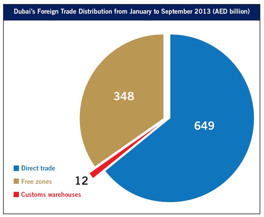 Moreover, direct trade accounted for 64 per cent of Dubai foreign trade as it reached Dh649 billion by the end of Q3 2013, up from Dh595 billion for the same period in 2012. While free zones trade share stood for 35 per cent, that is, Dh348 billion, compared to Dh316 billion; customs warehouse trade hit Dh12 billion, up from Dh6 billion last year.
