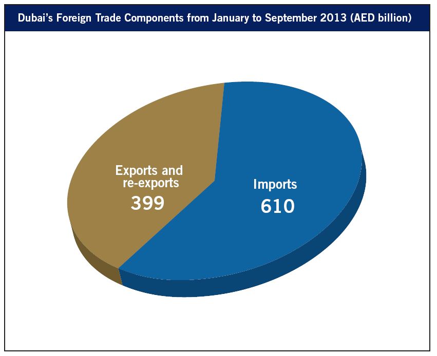 Dubai Customs statistics showed that Dubai’s non-oil foreign trade growth was the result of the increase in imports till Q3 of 2013; reaching Dh610 billion, as compared to Dh546 billion in the same period last year. In addition, exports and re-exports rose to Dh399 billion, compared to Dh372 billion.