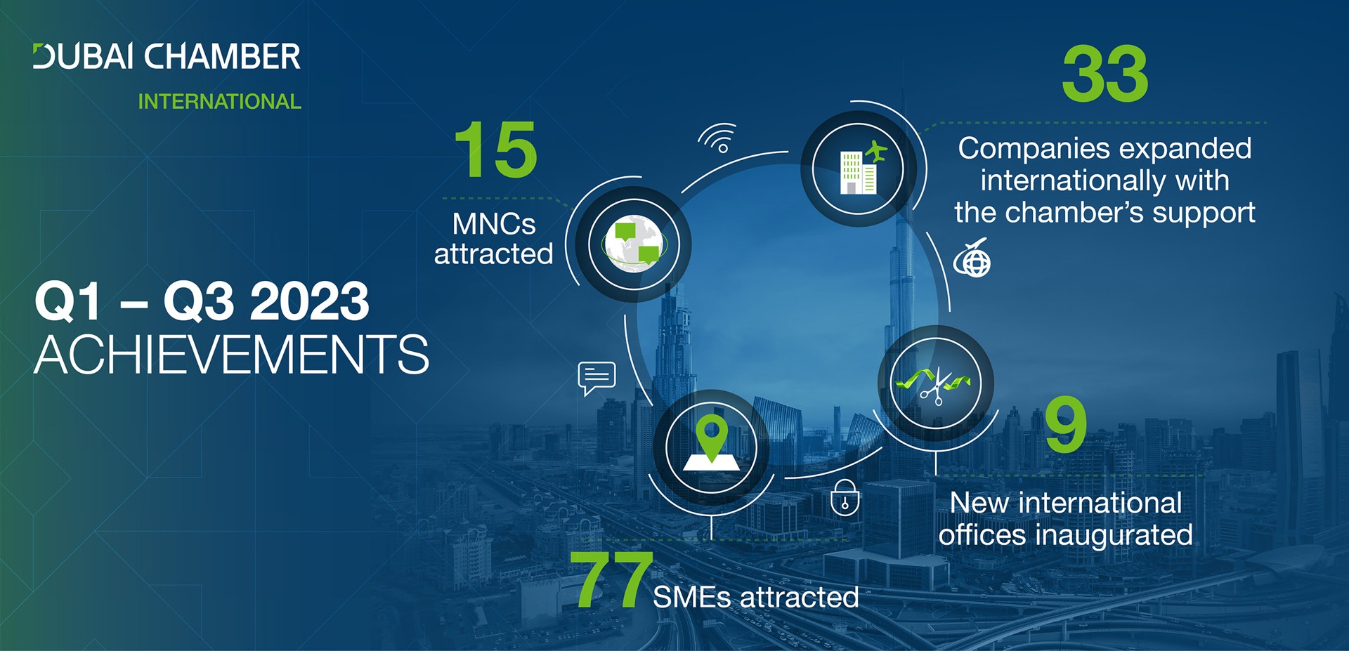 Dubai International Chamber supports Dubai’s vision of expanding into new global markets, forging cross-border economic partnerships, and supporting local companies in achieving global success, while also attracting international companies, investors, and talent from around the world. The chamber is targeting 30 international markets of strategic importance through its growing network of international representative offices.Dubai International Chamber boosts inward FDI with the successful attraction of 15 multinational companies and 77 SMEs to Dubai between Q1 and Q3 2023
