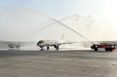 Egyptian carrier Nile Air receives water canon salute at Al Ain International Airport (Supplied)