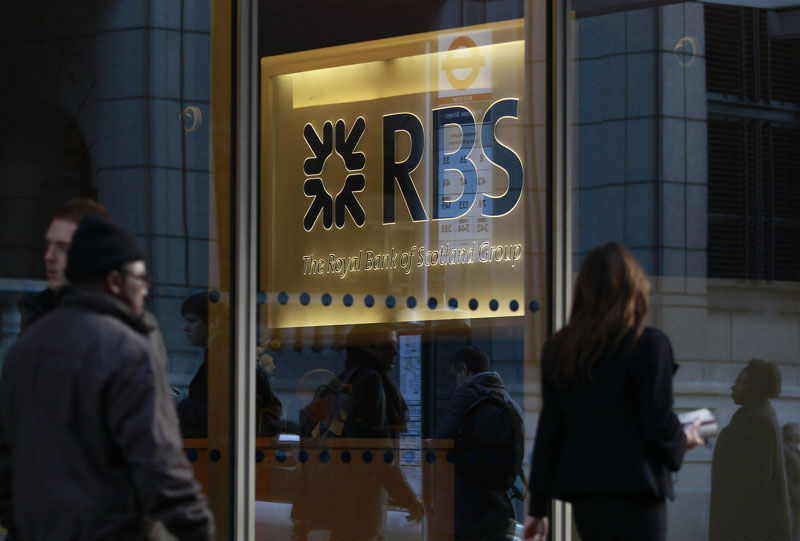 People walk past a Royal Bank of Scotland (RBS) building in the City of London in this file photo. (Reuters)