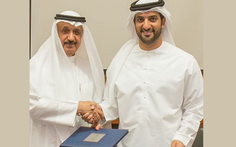 Sheikh Sultan bin Ahmed Al Qassimi and Ahmed Al Midfaa at the agreement signing ceremony (SUPPLIED)