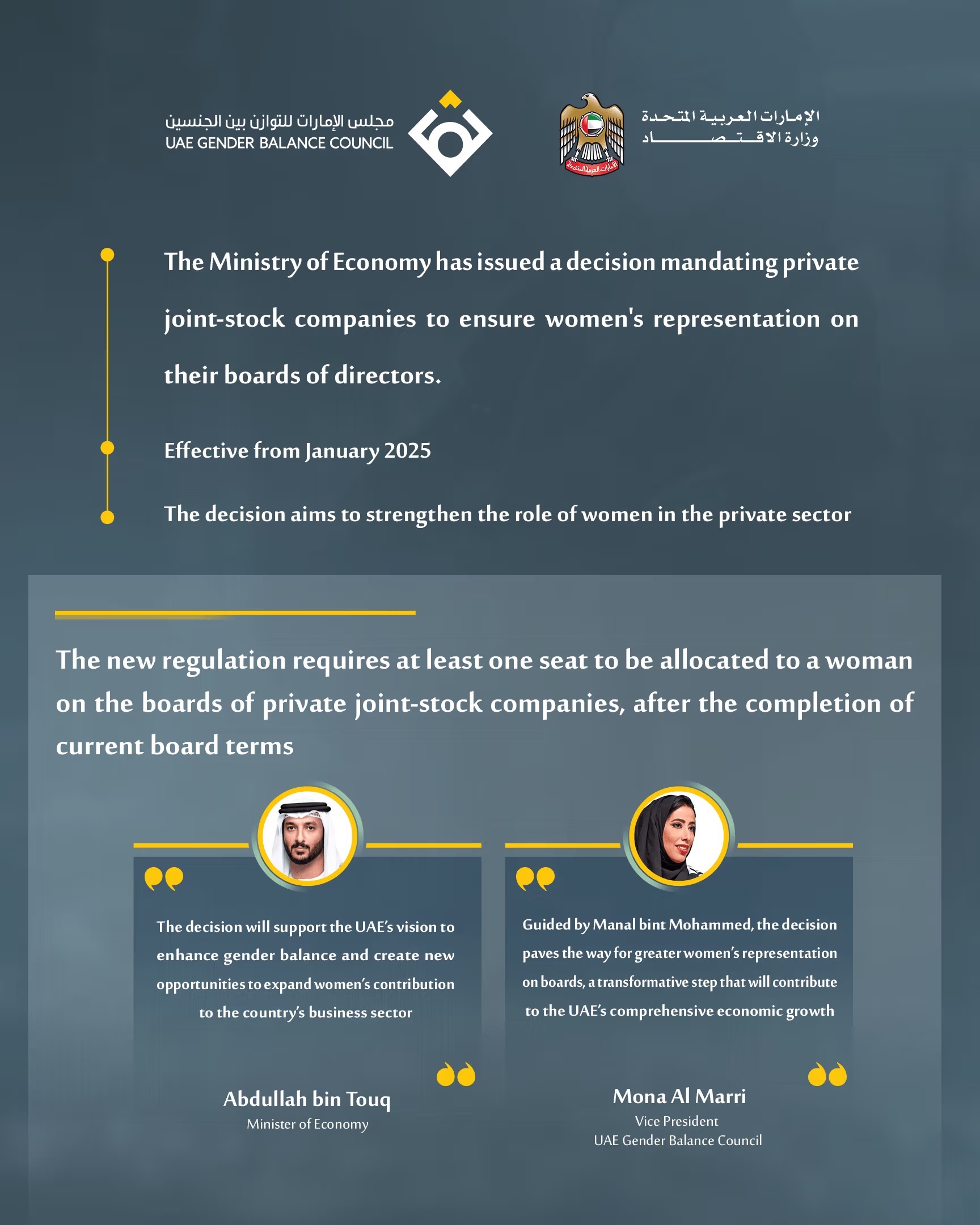 “Guided by Her Highness Sheikha Manal bint Mohammed bin Rashid Al Maktoum, the decision paves the way for greater women’s representation on boards, a transformative step that will contribute to the UAE’s comprehensive economic growth. Aligned with Her Highness’s vision of women as essential partners in the nation’s development across sectors, the decision reaffirms the UAE’s strong record and global leadership in gender balance,” Her Excellency said.