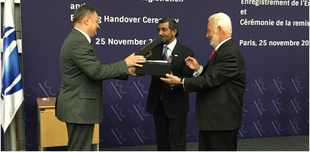 To mark Dubai's formal appointment, Sheikh Ahmed was presented with the official BIE flag by the governing body's President Nagy.