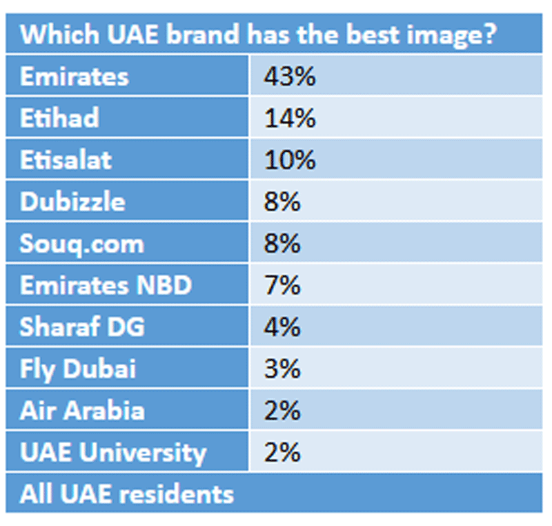 The report, published by Dubai-based integrated communications agency IHC, reveals the Top 10 UAE brands as seen through the eyes of UAE residents, with Abu Dhabi-based Etihad ranked a distant second (seen as the best UAE brand by 14 per cent of those polled).