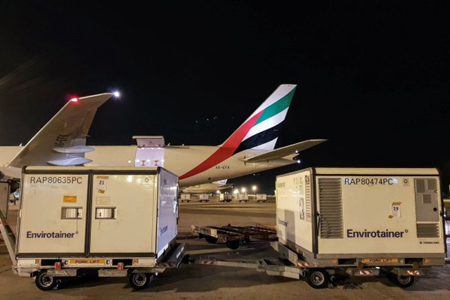 Emirates SkyCargo has transported over 25 tonnes of vaccines from Milan to BH airport, Bello Horizonte in Brazil on its Boeing 777 freighter aircraft. This is the largest shipment of vaccines that the air cargo carrier has transported on a single flight and it is also the first time that BH Airport has received such a large shipment of vaccines.