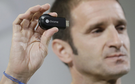 The new device, called Chromecast, is part of the company's attempt to make it easier for people to access Internet content on their TVs. Chromecast is a small stick roughly the same size as a thumb drive that can be plugged into an HDMI port on flat-panel TVs. It brings Netflix, Google's YouTube site and other Internet content to what is usually the biggest screen in households.