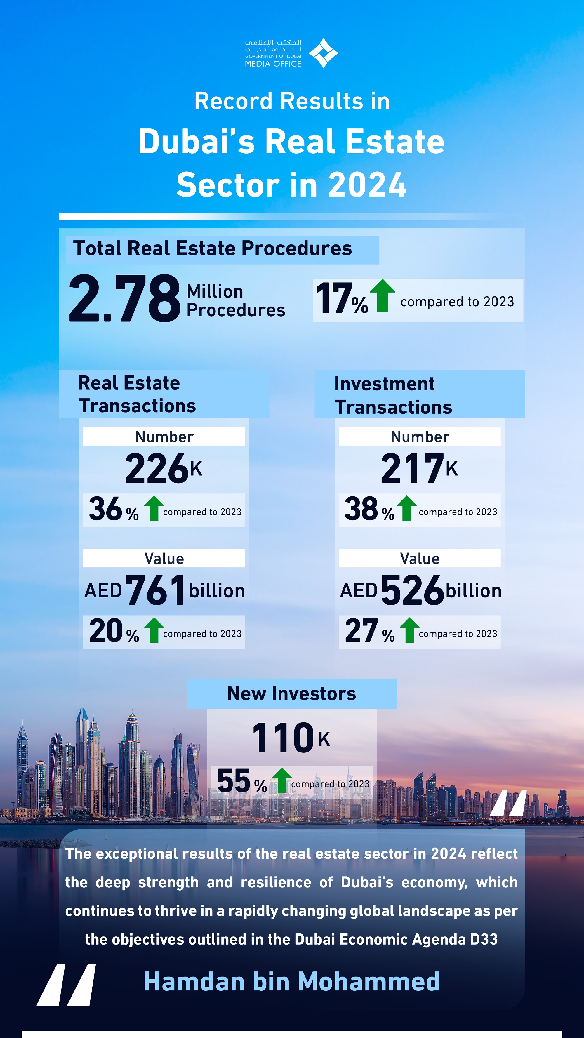 - Dubai’s real estate sector recorded a total of 2.78 million procedures in 2024, the highest in its history. The record number of procedures, which include both real estate transactions and rental agreements, represent a 17% increase compared to 2023. Real estate transactions alone totalled 226,000, with a combined value of AED761 billion, a remarkable 36% - growth in volume and 20% growth in value year-on-year.