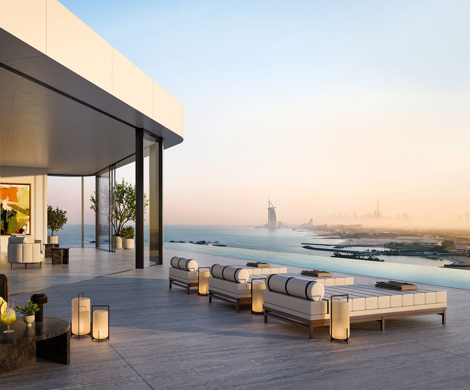 Ava is a super exclusive development in palm Jumeirah with only 17 residences, AVA at Palm Jumeirah, Dorchester Collection has exclusive residences with direct access to private terraces with a pool, floor-to-ceiling windows, and a stunning 270-degree floor-to-ceiling view private beach and all the 5-star amenities of Dorchester collection. This development will also boast one of the most stunning penthouses in the world, placed over multiple levels with a private panoramic elevator and private lobby. Due to the nature of the development, there are only simplexes, duplexes, and of course, the sky palace mansion with the largest infinity pool for a residential building which was sold by Deylami.