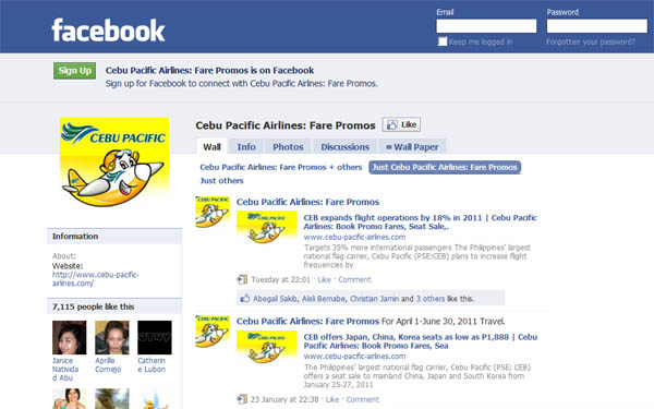 Cebu Pacific, a Philippine low-cost carrier, said it has enjoyed significant success on Facebook. "Facebook is one of the social media channels that we use a lot," said the airline's chief executive adviser Garry Kingshott. "We have our own fan page but we actually have people create other fan pages -- Cebu Pacific fan pages that have even got bigger."
