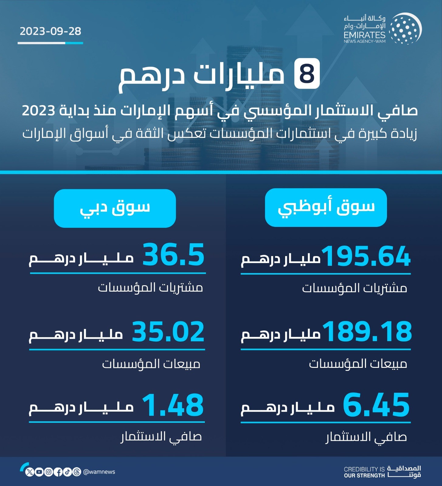 Total purchases of local shares by institutional investors amounted to AED 232.15 billion, while total sales were AED 224.2 billion, according to data from the Abu Dhabi Securities Exchange (ADX), and Dubai Financial Market (DFM)