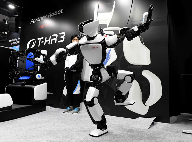 The T-HR3 has 32 joints and boasts smooth human-like movements. It can also balance itself in one-legged poses. Sensors on the robot can detect how much force it should exert on humans or objects.