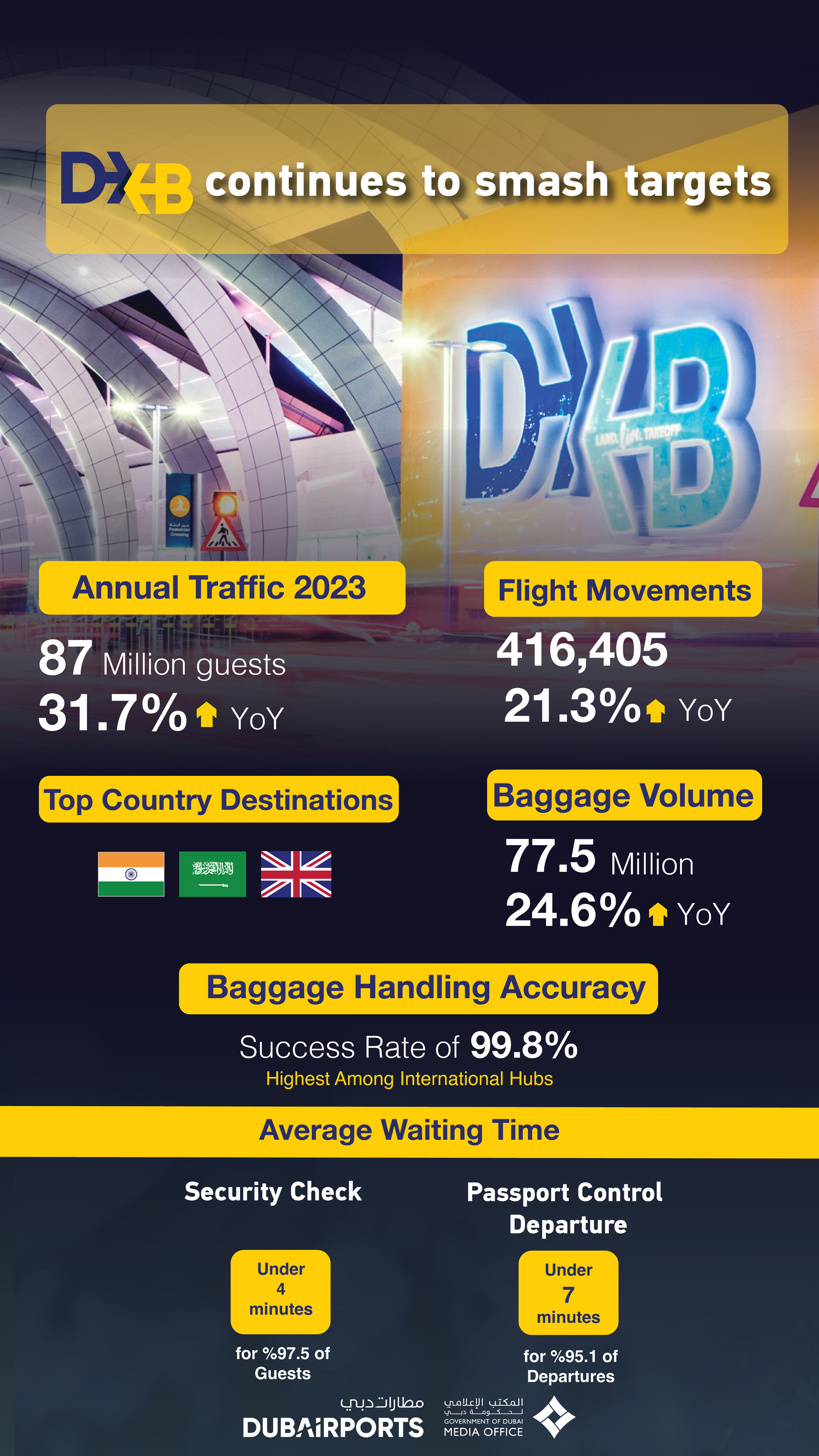 DXB processed an impressive total of 77.5 million bags in 2023, making it the highest volume of bags managed during a calendar year at the airport. Despite 24.6% year-on-year increase in baggage volume, DXB maintained its unmatched success rate of 99.8%, with only 2.4 mishandled bags per 1,000 passengers.