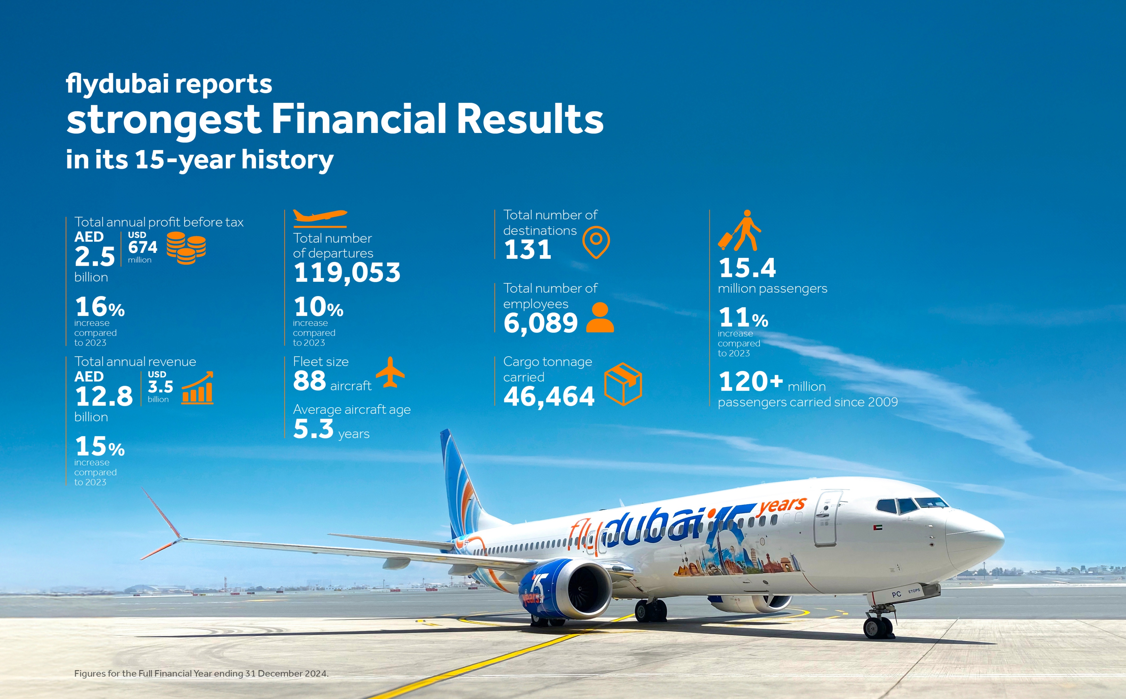 The Dubai-based carrier marks its strongest-ever financial performance in its 15-year history, reporting a pre-tax profit of AED 2.5 billion (USD 674 million); a 16% growth compared to the previous financial year with a total revenue of AED 12.8 billion (USD 3.5 billion), marking an increase of 15% compared to AED 11.2 billion (USD 3 billion) in 2023. The new milestone was driven by the strength of flydubai’s diverse network as well as its strong and agile business model.