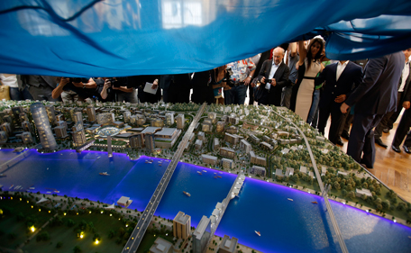 Promoters uncover the Belgrade Waterfront project model during the project's presentation in Belgrade, Serbia, Friday, June 27, 2014. A company based in the United Arab Emirates says it will invest up to 4 billion euros ($5.4 billion) to build a business, residential and commercial area in the river zone of the Serbian capital, Belgrade. Eagle Hills unveiled Friday the Belgrade Waterfront project designed to completely rebuild a run-down area at the heart of the Balkan city of two million people.(AP)