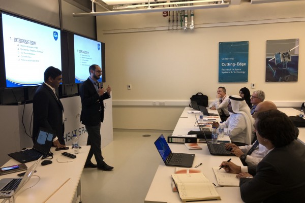 The Preliminary Design Review, PDR, was held during a meeting at Masdar Institute, and Chaired by Khaled Al Hashmi, Director of Space Mission Management at the UAE Space Agency. The meeting brought together representatives from Khalifa University of Science and Technology, AURAK, Mohammed bin Rashid Space Centre, Al Yah Satellite Communications Company, and the National Space Science and Technology Center at the UAE University.