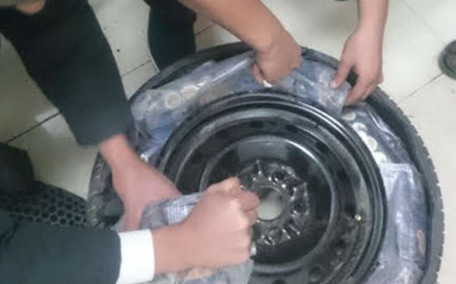 Saudi customs men seized nearly 43kg of hashish concealed inside a car tyre as the vehicle tried to cross the border from nearby Yemen.