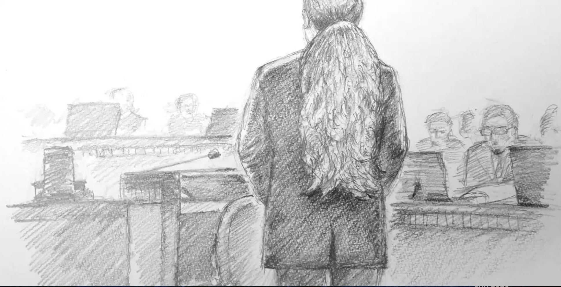 He wore a black suit with his hair in a long ponytail down to his waist, and was flanked by six uniformed court officers wearing surgical masks.
