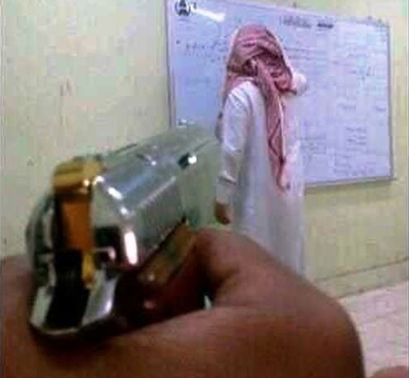 The picture, published in the Saudi Arabic language daily Sada, showed the student aiming a gun at his teacher whose back was to the students while giving a lesson. Neither the student nor the teacher and other school boys’ faces are seen in the picture as it was taken by the armed school boy.