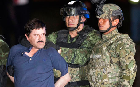 In this Jan. 8, 2016 file photo, Joaquin "El Chapo" Guzman is made to face the press as he is escorted to a helicopter in handcuffs by Mexican soldiers and marines at a federal hangar in Mexico City, Mexico, following his recapture six months after escaping from a maximum security prison. Guzman's lawyers said Friday, Feb. 19, 2016 he told them that guards at Mexico’s Altiplano prison won’t let him sleep, and that plans to make a movie about his life with Mexican actress Kate del Castillo are still on. (AP)
