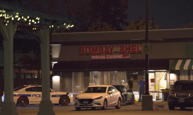 Police stand outside the Bombay Bhel restaurant in Mississauga, Canada. (AP)