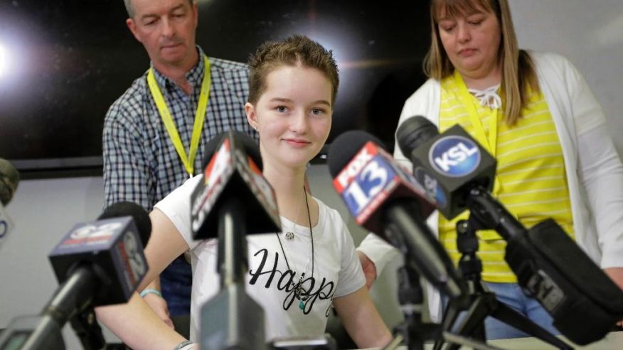 The 14-year-old arrived in a wheelchair. She had short hair, a brace on her lower left leg and wore a shirt that said, "Happy" on the front and on the back: "There are so many beautiful reasons to be happy."