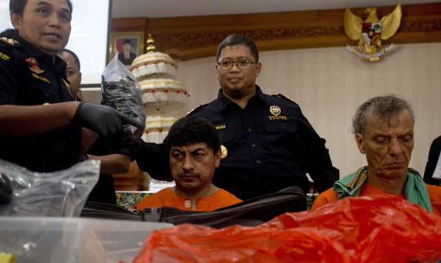 Peruvian Jorge Albornoz Gamarra, center, and German Frank Zeldler, right, sit next to evidence and Indonesian custom officers during a press conference in Bali, Indonesia. (AP)
