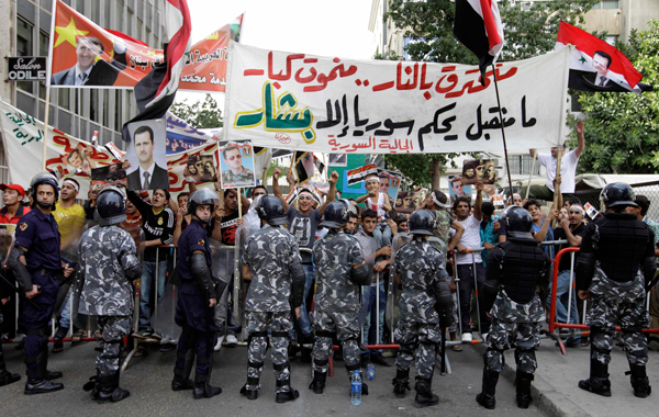 Lebanese riot police officers stand guard between supporters and opponents of Syrian President Bashar Assad's regime, during a protest in front of the Syrian embassy, in Beirut, Lebanon, Sunday, Oct. 23, 2011. (AP)