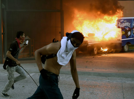 Students from the Ayotzinapa school run from a burning car during a protest outside the State Government headquarters in Chilpancingo, Guerrero State, on November 8, 2014. (AFP)