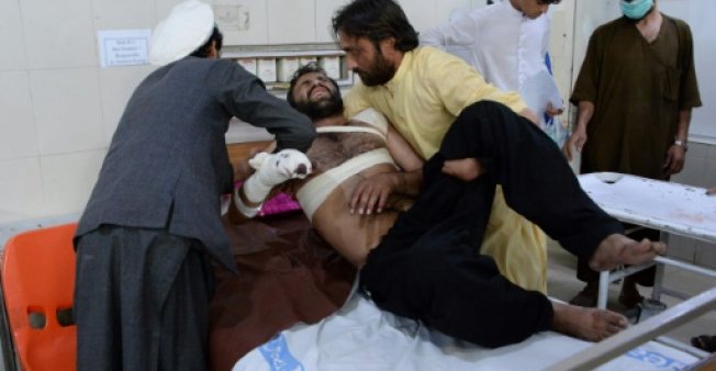 A victim is helped by relatives at a hospital after eight people were killed and 45 wounded in a series of explosions targeting a cricket match in the eastern Afghan city of Jalalabad. (AFP)