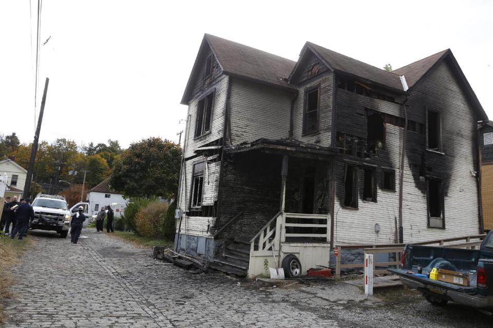 Emergency workers gather in front of a burned house in McKeesport, Pa. (AP)