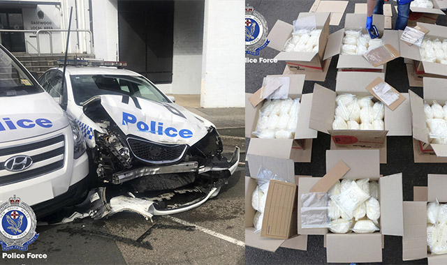 Australian authorities have uncovered a US$140 million stash of amphetamines after an alleged criminal's run-in with the law saw his drug-filled van crash into an officer's car outside a police station.