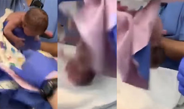 The 12-second clip shows their premature daughter slipping out of a worker’s hands, falling less than a foot and landing on a table.